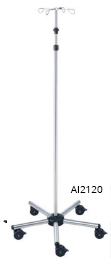 AI2120: Droppställning med hjul för krävande förhållanden. Rostfritt stål, 4 krokar, kapacitet 4 × 2 kg. Enhands höjdjustering 152–222 cm. Dubbelhjul 5 × 75 mm, varav två är låsbara och antistatiska. Robust fot, totalvikt 11 kg och diameter 63 cm.
